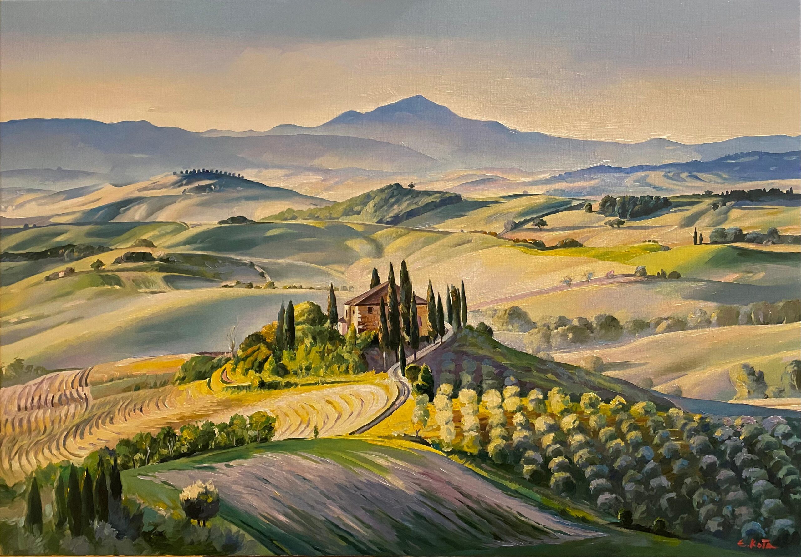 Ein modernes Ölgemälde, inspiriert von der ruhigen Landschaft der Toskana. Sanfte Hügel, warmes Licht und klare Formen schaffen eine zeitlose, harmonische Atmosphäre.